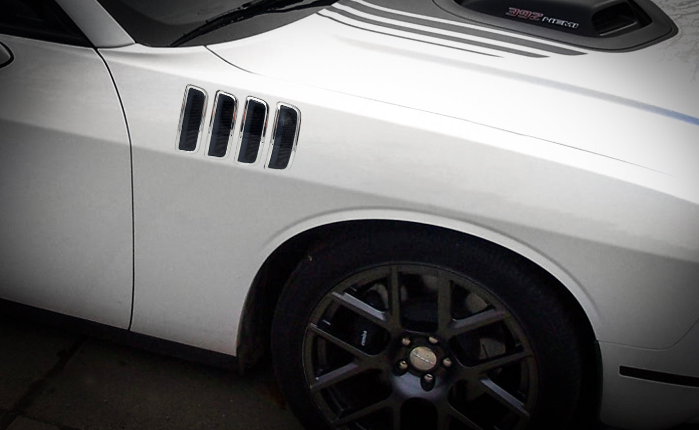 Our "Cuda" inspired fender accents are a fantastic way to add that retro muscle flair to your Challenger. These are more than just decals. With a resin-filled, shiny mirror-chrome border that is dimensional and classic, these might be even better than the originals.
