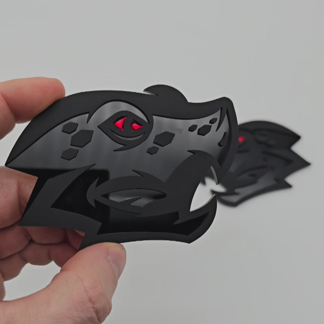 These acrylic badges are dimensional in their solid filled satin/gloss black design with an inlaid red eye.