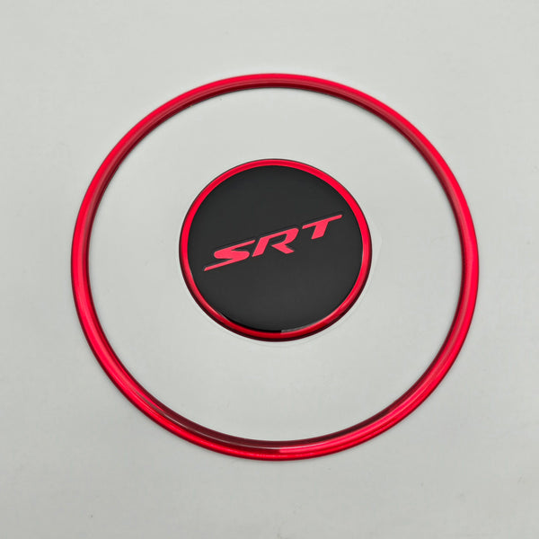 Our "SRT" Steering Wheel Center Badge is offered in your choice of 10 available colors to customize the badge to your desired color scheme. The background of the badge is satin black, tying in nicely with the finish of the wheel, and the selected color will apply to the lettering, border, and outer ring if selected. (image shown with color selected as 'Red').